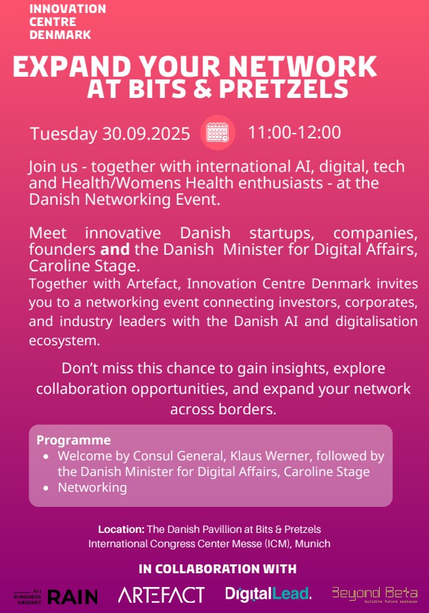Gain fresh perspectives on AI & digitalisation and grow your network at an evening hosted by Innovation Centre Denmark & Invest in Denmark. Meet the Danish innovation ecosystem, connect with German & Danish industry and research leaders, enjoy startup pitches, networking, food & drinks, and build new international partnerships.